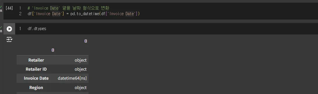 Invoice Date 칼럼을 object가 아니라 datetime으로 바꿔주는 코드를 실행합니다.