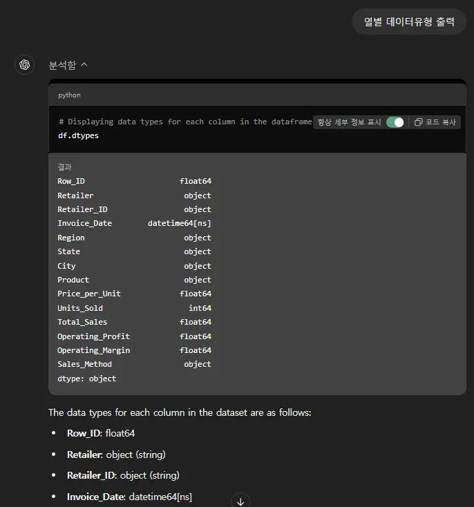 GPT가 각 칼럼의 데이터 유형을 재정의하고 있어요.