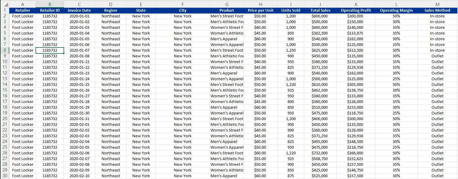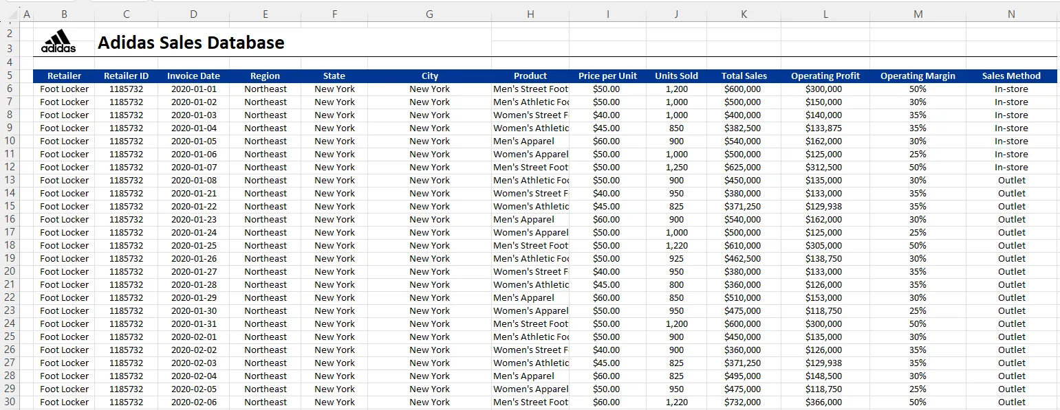 엑셀에서 1~4행이 비어있고, C2 셀에는 Adidas Sales Database 라는 텍스트가 적혀있어요.